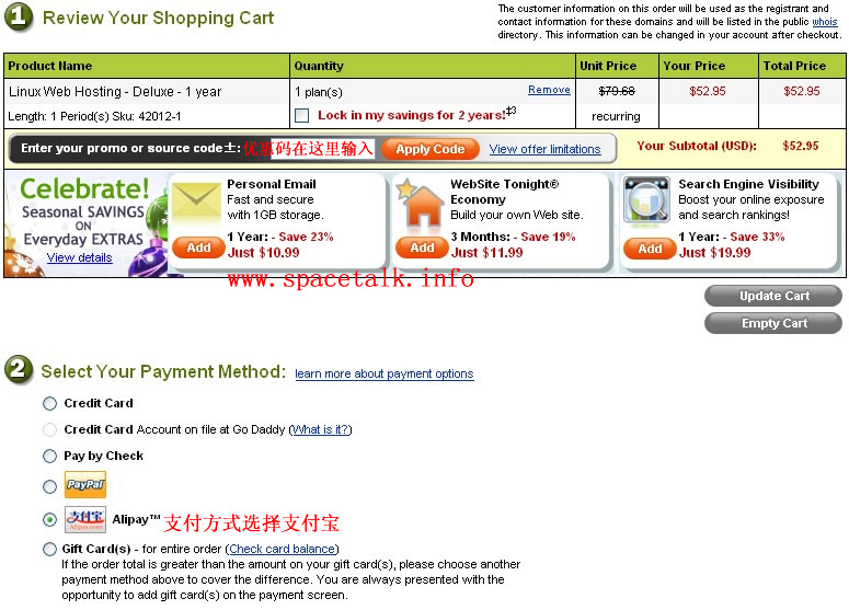 Godaddy 支付寶人民幣支付購買空間的圖解教程