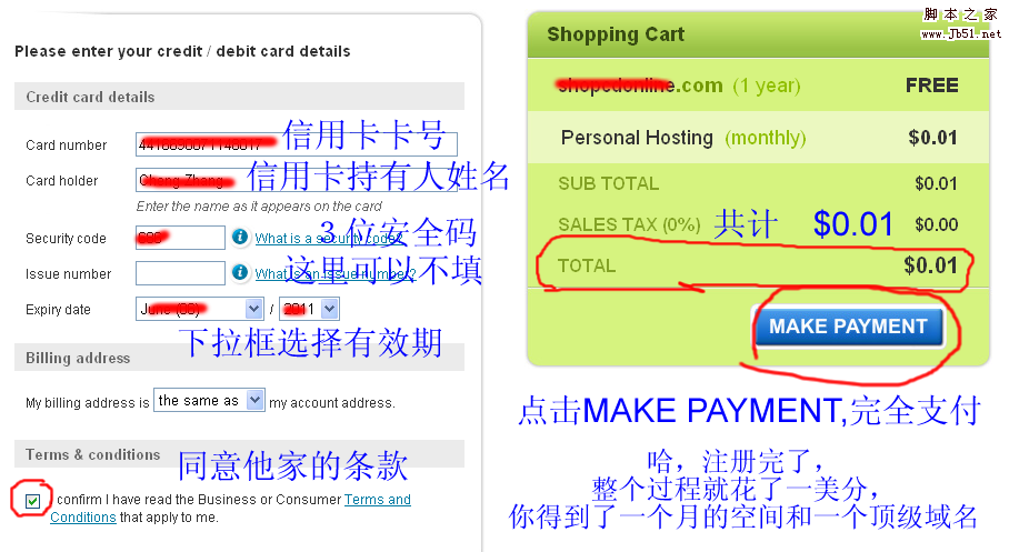 點(diǎn)頁面下方“Continue to Payment”輸入卡號、所有者英文姓名(卡面上的)、安全碼(卡背面后3位數(shù)字)、有效期,選中下面的同意服務(wù)條款。點(diǎn)右面藍(lán)色“MAKE PAYMENT”按鈕。頁面顯示“Payment accepted”說明已經(jīng)成功提交訂單,即你注冊的域名和美國主機(jī)已經(jīng)付款成功。你會收到一封主題為“Welcome to SimplyHosting!”的歡迎信。