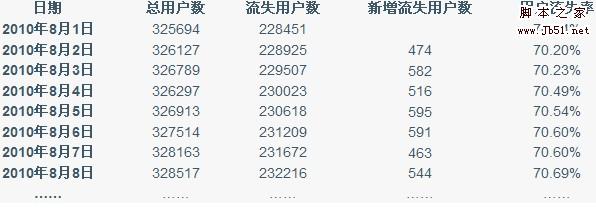 首先需要明確的是用戶的流失可能并不是永久的,也許用戶在一段時間內(nèi)對網(wǎng)站確實沒有任何需求,那么他會遠離網(wǎng)站一段比較長的時間;或者流失用戶也會因為網(wǎng)站的某次營銷或者網(wǎng)站質(zhì)量的改善而重新回來。網(wǎng)站總的流失用戶數(shù)的計算比較簡單,以超過1個月內(nèi)登錄即為流失為例,那么總流失用戶數(shù)就是所有“當前時間點-用戶最近一次時間點》1個月”的用戶數(shù)量。但是單純的總流失用戶數(shù)量對于分析是沒有意義的,因為大部分情況下這個數(shù)值是一直遞增的,我們需要計算總流失用戶數(shù)占總用戶數(shù)的比例及新增流失用戶數(shù),觀察它們的變化趨勢,如下表: