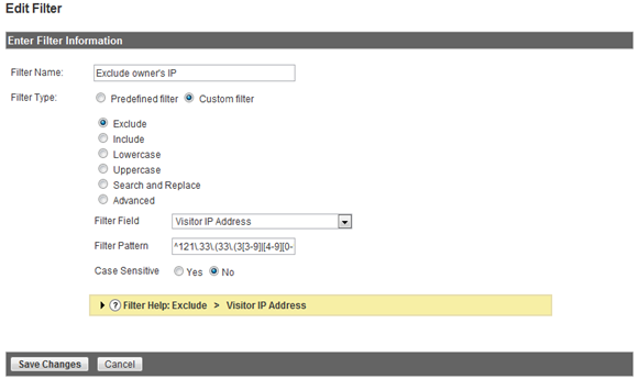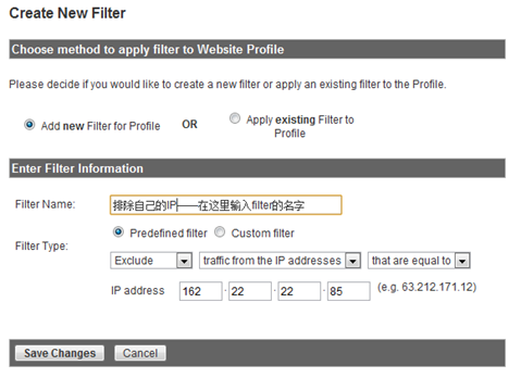 這里,我們在Filter Pattern中用到了正則表達式:^121\.33\.(33\.(3[3-9]|[4-9][0-9]|1([0-9][0-9])|2([0-4][0-9]|5[0-5]))|((3[4-7])\.([0-9]|[1-9][0-9]|1([0-9][0-9])|2([0-4][0-9]|5[0-5])))|38\.([0-9]|[1-9][0-9]|1([0-9][0-9])|2([0-4][0-9]|5[0-4])))$。哈哈,可怕吧!別擔心,其實你訪問這個地址,就能自動生成你IP段的正則表達式了:https://www.google.com/support/googleanalytics/bin/answer.py?answer=55572&hl=en_US&utm_id=ad。Google自己的這個工具很好用。