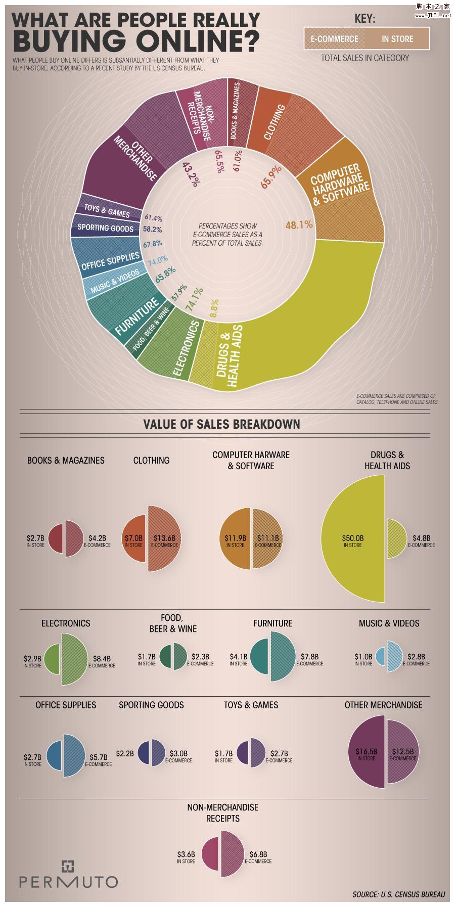 美國統(tǒng)計局的一項研究數(shù)據(jù)顯示,在商品銷售總額方面,由線下占據(jù)多數(shù);不僅如此,在每個單獨的品類上,也大都是線下購買多于線上購買。然而在有幾個商品品類,線上購買占據(jù)了主導(dǎo)位置。這些品類包括:書籍和雜志,服飾,電子產(chǎn)品。