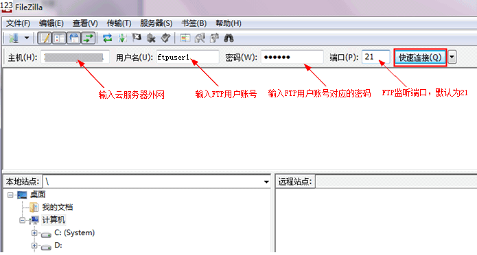 運行FileZilla,按下圖所示進行配置,配置后點擊“快速鏈接”: