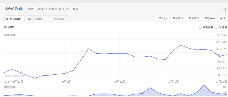 微商的百度指數(shù)已經(jīng)2萬多一天了,微商可以說是繼淘寶之后的又一個全民創(chuàng)業(yè)的東西?! ?/p>