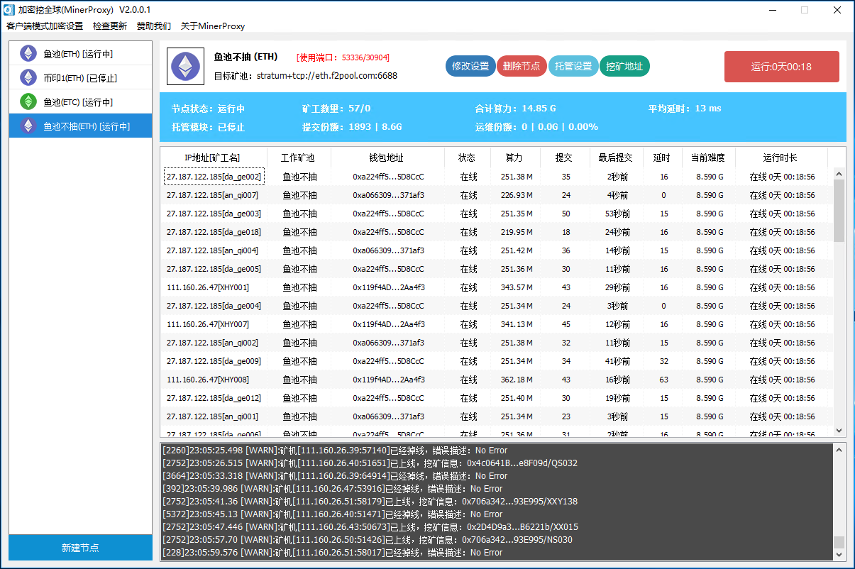 MinerProxy采用IOCP超高性能的網(wǎng)絡(luò)框架編寫,具有穩(wěn)定性高,傳輸速度快,并發(fā)強等優(yōu)點。 擁有30天軟件不重啟記錄; 擁有最快傳輸速度即全網(wǎng)最低延遲; 擁有超高帶機量,單主機理論帶機量可以上萬,4核4G主機穩(wěn)定帶機5000無壓力。