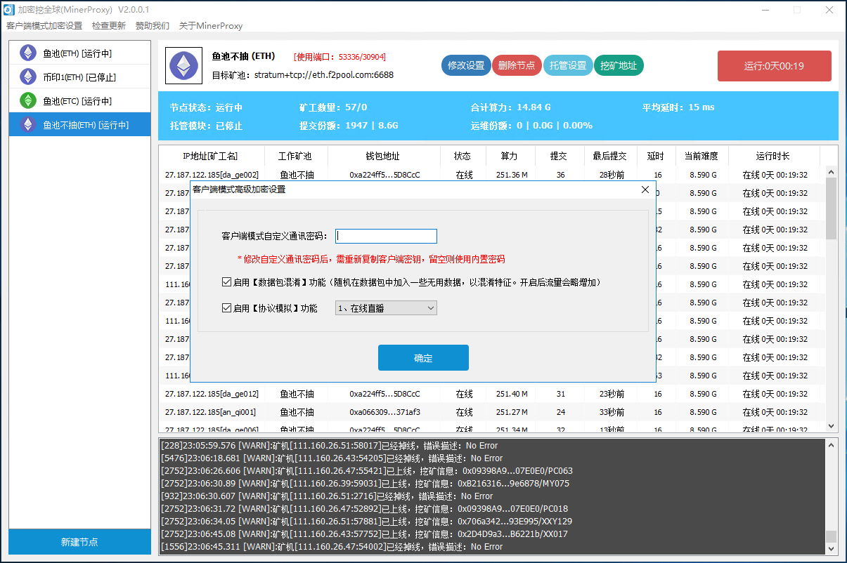 MinerProxy可快速實現(xiàn)一鍵搭建任意礦池和多幣種含(ETH/ETC/RVN/ERGO/AE/BTC等)的中轉(zhuǎn)節(jié)點; MinerProxy支持任意SSL+TCP礦池,SSL加密,SSL解密,支持任意第三方挖礦軟件和OS系統(tǒng); MinerProxy支持協(xié)議模擬功能,即任意礦池可SSL加密傳輸和TCP傳輸,自行體驗; MinerProxy支持同時多個礦池的轉(zhuǎn)發(fā),有精準(zhǔn)清晰的礦機數(shù)據(jù)展示列表; MinerProxy為運維管理者而生,自動攔截挖礦內(nèi)核抽水增加業(yè)主算力。在保持業(yè)主算力不受大的影響的情況下,可設(shè)置運維人員一定的分成。