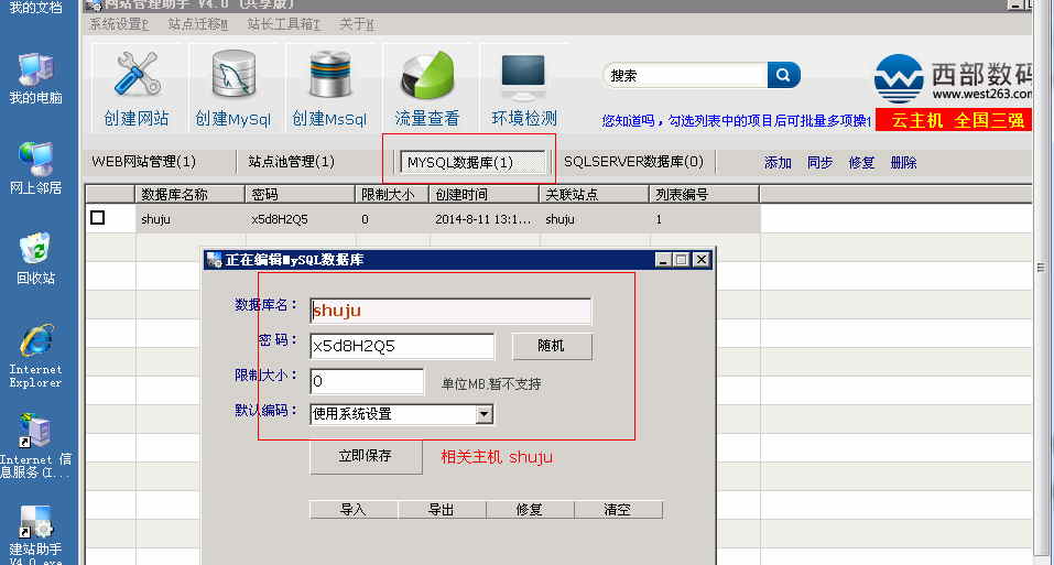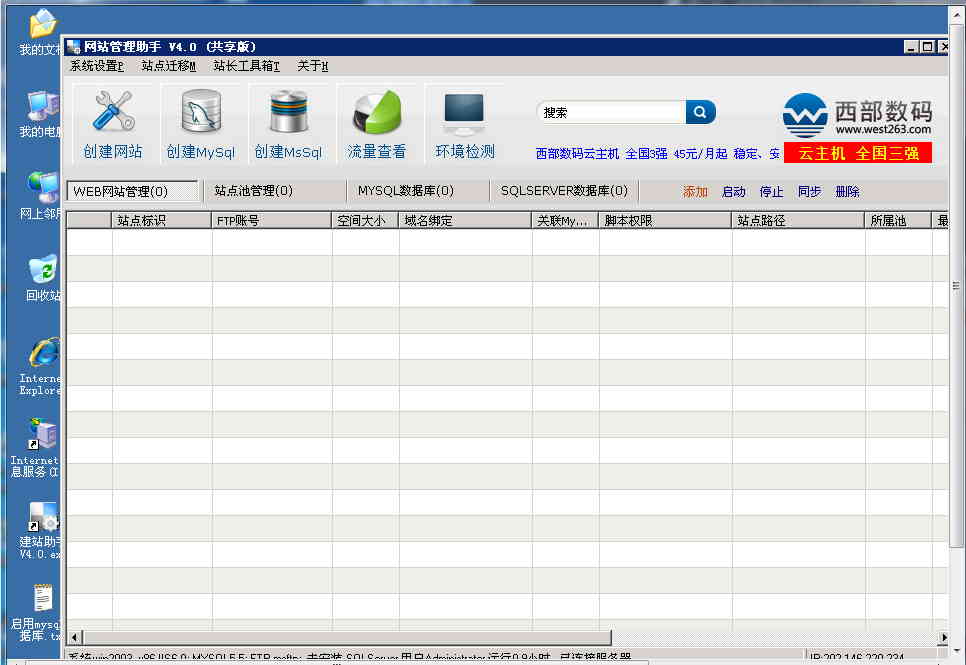 西部數(shù)碼網(wǎng)站管理助手管理助手,是一款自動(dòng)建立虛擬主機(jī)站點(diǎn)的程序,通過這個(gè)程序可以自動(dòng)建立IIS站點(diǎn)、FTP帳號、網(wǎng)站目錄、Mysql數(shù)據(jù)庫等,并且各網(wǎng)站以獨(dú)立用戶隔離運(yùn)行,解決FSO安全風(fēng)險(xiǎn)。特別適合于租用云主機(jī)、VPS的站長使用。本軟件還搭配了自動(dòng)化的服務(wù)器環(huán)境設(shè)置程序,能一鍵安裝PHP、Mysql、Zend、PhpMyadmin、FTp、Jmail等各種組件、自動(dòng)對服務(wù)器進(jìn)行安全設(shè)置防止黑客入侵,即使是不懂得服務(wù)器管理技術(shù)的非專業(yè)人員,也可以輕松管理服務(wù)器了。以下我們簡稱軟件為建站助手,可以在我們本站下載到,安裝之后便來開始下面的教程。