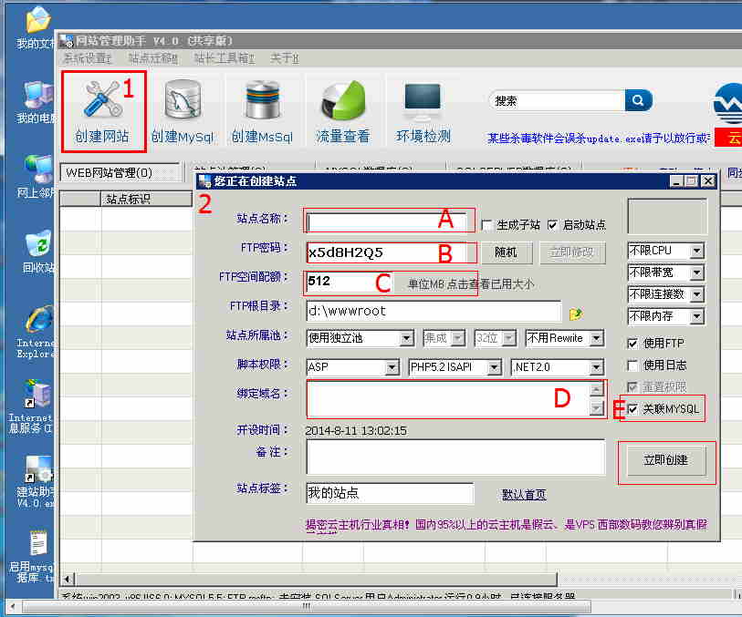 E:這里選擇就表示創(chuàng)建這個(gè)網(wǎng)站的同時(shí),也創(chuàng)建一個(gè)對應(yīng)的MYSQL數(shù)據(jù)庫,一般是建議勾選上.