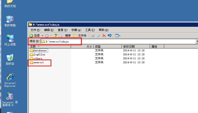 如上圖所示,我們創(chuàng)建的網(wǎng)站根目錄是d:\wwwroot\shuju,所以我們就去D盤里面找到這個(gè)文件夾,如下圖所示: