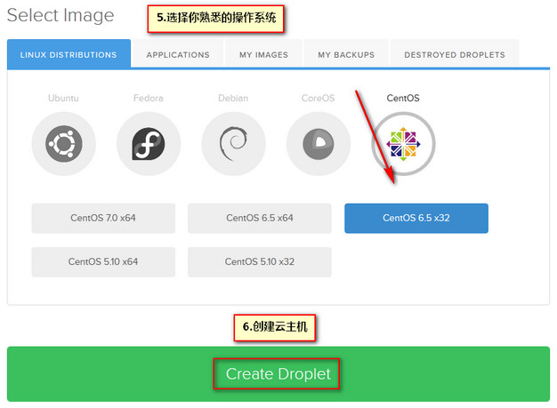 三、選擇你比較熟悉的操作系統(tǒng),因?yàn)樾之前有折騰過CentOS,所以這里選擇了32位的CentOS6.5操作系統(tǒng)。最后點(diǎn)擊創(chuàng)建按鈕。