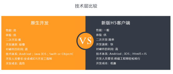 從技術(shù)層面比較,在性能上,雖然H5混合開發(fā)一般,但是相對于原生開發(fā)來說,在二次開發(fā)方面,H5混合開發(fā)二次開發(fā)簡單,開發(fā)速度快,開發(fā)成本較低廉。