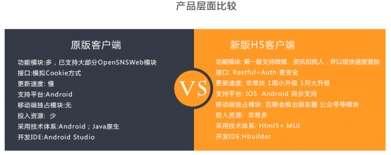 從產(chǎn)品層面比較,OpenSNSV2新版H5客戶端采用Restful+Auth接口更安全。在更新速度上非???,1周小升級,1月大升級。以前的客戶端只支持Android,新版H5客戶端將實現(xiàn)IOS、Android同步支持,這增加了OpenSNS在移動端方面更多的可能性。