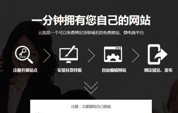 第一步:注冊(cè)系統(tǒng)。登錄云指(www.72e.net)注冊(cè)領(lǐng)取一個(gè)免費(fèi)的建站系統(tǒng)。相對(duì)于市場(chǎng)上其他的免費(fèi)建站系統(tǒng),云指建站有個(gè)好處就是可以綁定自己的域名。