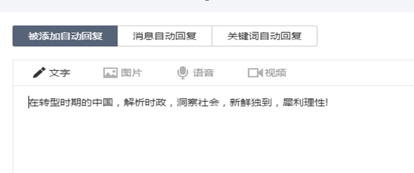 而自動回復(fù)也是一個相當(dāng)重要的功能,被添加自動回復(fù)就是粉絲關(guān)注你之后顯示的那條歡迎語,消息自動回復(fù)是粉絲在對話框里給公眾號發(fā)送消息,公眾號可以設(shè)置一些相關(guān)的回復(fù)內(nèi)容,而關(guān)鍵詞自動回復(fù)是指粉絲通過在對話框中輸入關(guān)鍵詞,系統(tǒng)自動回復(fù)想要的文字、資源、鏈接。靠這些功能可以完成和粉絲之間的一種被動交流,是維系粉絲關(guān)系的好方法。