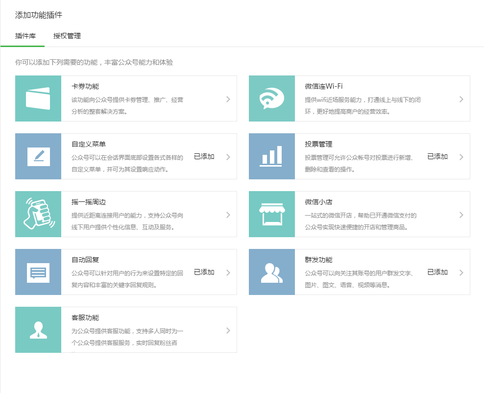 另外在最下方還有添加功能插件的功能,實(shí)際就是為運(yùn)營公眾號提供更多的功能拓展,這里還包括了第三方插件的授權(quán)管理,讓你把公眾號的功能做得更強(qiáng)大,內(nèi)容更豐富,通過這些插件的添加使用,讓你做出一個有個性的公眾號。值得注意的是,這里還可以通過公眾號來開啟微店的功能,幫助你做好把粉絲轉(zhuǎn)化成消費(fèi)者。