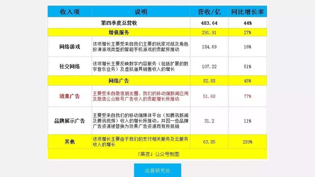 這是騰訊2016年第四季度的財(cái)報(bào),其中以微信為主要載體的效果廣告營(yíng)收51.68億,占騰訊整個(gè)廣告營(yíng)收的62.3%,同比增長(zhǎng)率達(dá)到驚人的77%。相比百度第四季度的網(wǎng)絡(luò)營(yíng)銷營(yíng)收161.66億。說(shuō)明微信廣告開始爆發(fā)并有著巨大增長(zhǎng)空間。