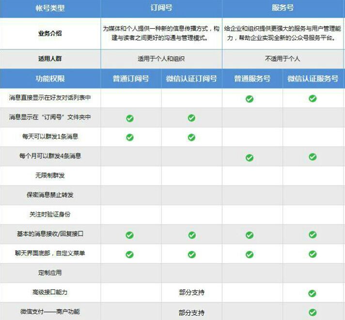 說(shuō)到這里很多小型企業(yè)會(huì)認(rèn)為,訂閱號(hào)天天都能推送文章,豈不是優(yōu)勢(shì)明顯,那為什么還要選擇服務(wù)號(hào)?其實(shí)更大的差別在這里——各種高級(jí)接口和支付功能。
