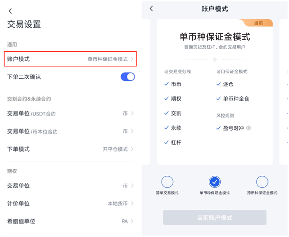 當(dāng)您擁有數(shù)字資產(chǎn)之后,接下來(lái)還有前期最關(guān)鍵的的一步——賬戶模式設(shè)置,這將決定您可交易的業(yè)務(wù)線種類。
