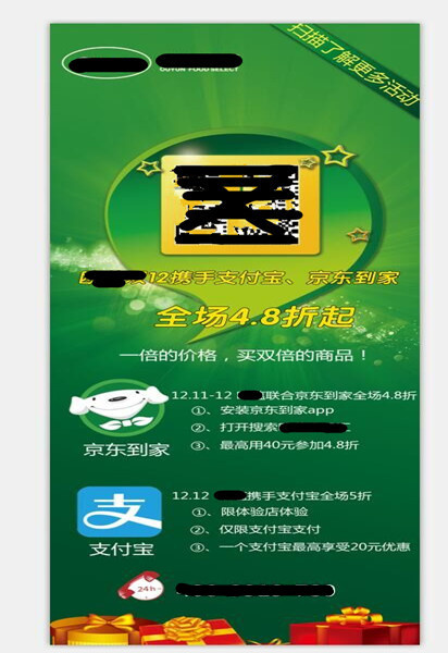 在分析完用戶心理后,他們開(kāi)始著重進(jìn)行活動(dòng)策劃的相關(guān)安排?;顒?dòng)是以線上線下同步展開(kāi)的方式進(jìn)行?;顒?dòng)內(nèi)容主要以商品打折為噱頭。4.8折的商品折扣已足夠吸引力,如果再免費(fèi)送到家呢?而且使用京東APP與支付寶的用戶,在4.8折的基礎(chǔ)上將另有優(yōu)惠,在幾重優(yōu)惠的吸引下,他們相信用戶一定會(huì)被打動(dòng)。