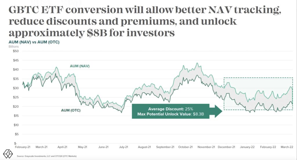 據(jù)CNBC獲得的資料,灰度表示將GBTC轉(zhuǎn)變?yōu)樵诩~約證券交易所交易的ETF,將擴大比特幣的獲取渠道并加強其保護;此外自2021年初以來,GBTC基礎(chǔ)資產(chǎn)價格的平均折價為-25%,該折價應(yīng)在轉(zhuǎn)換后消失,因此為投資者釋放高達80億美元的價值。