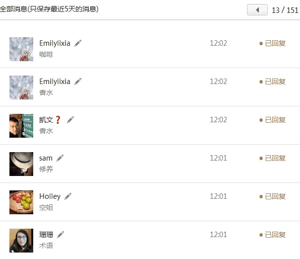 關(guān)鍵詞回復(fù),一定要好好用,這相當(dāng)于你雇傭了一個(gè)機(jī)器人24小時(shí)為你推送消息。很多人設(shè)置回復(fù)數(shù)字來(lái)獲取相關(guān)圖文,其實(shí)我建議是用關(guān)鍵詞。看下圖,每人經(jīng)過(guò)不同的關(guān)鍵詞就可以了解到他感興趣的文章,除了通過(guò)菜單,我還在微信圖文文末添加了私人管家部分文章導(dǎo)讀,添加關(guān)鍵字和相關(guān)文章,這樣還可以吸引未關(guān)注你的人來(lái)關(guān)注你。這5天消息有151頁(yè),每頁(yè)有20條,一共有3000條消息,每天消息量達(dá)到600條。