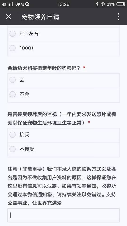 該表格內(nèi)容簡(jiǎn)單,無實(shí)質(zhì)性內(nèi)容,特別強(qiáng)調(diào)了不收集聯(lián)系方式,有領(lǐng)養(yǎng)通知會(huì)通過本公眾號(hào)回復(fù),再一次打消了用戶顧慮并增強(qiáng)了用戶黏性。