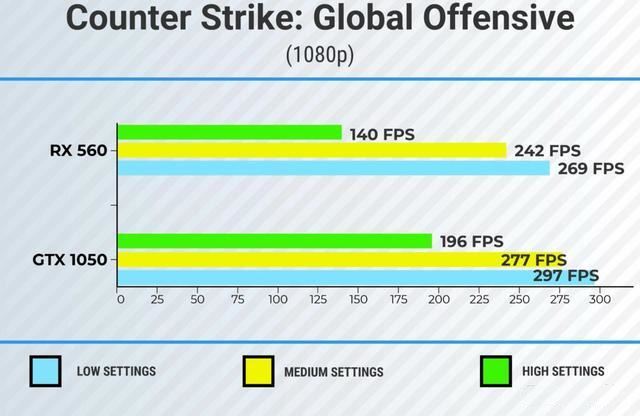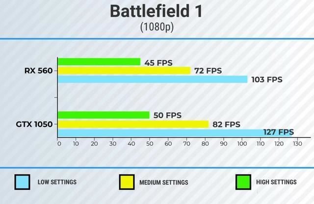 在低、中設(shè)置下,1050的平均FPS領(lǐng)先約12%。低點并不那么接近;在低設(shè)置下,GTX 1050在1%和0.1%的低點上領(lǐng)先接近60%,而在中等設(shè)置下,這一領(lǐng)先優(yōu)勢有所增加。在中等設(shè)置下,GTX1050的1%low幀高出75%,0.1%low幀是RX560的兩倍以上。在高設(shè)置下,560的平均FPS落后于GTX 1050高達40%,而它的low幀又比GTX 1050低了近50%。