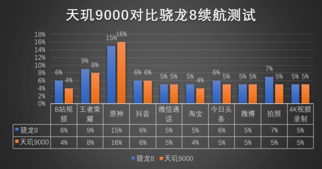 在輕度、中度負(fù)載情況下,驍龍8和天璣9000的差異性并不大,在此前的對(duì)比測(cè)試中,像是微信語(yǔ)音通話、微博、今日頭條、淘寶等不需要頻繁調(diào)動(dòng)超大核的應(yīng)用,天璣9000和驍龍8二者的續(xù)航表現(xiàn)幾乎一致。