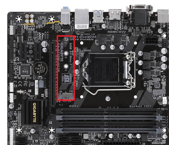 如果不知道自己的主板支持哪種接口,可以先查下主板品牌和型號(hào),然后訪問(wèn)主板官網(wǎng)就能查到。實(shí)在找不到型號(hào)就自己打開機(jī)箱,看下主板上有沒有M.2插槽,插槽大約兩根手指大小,一般在CPU散熱與顯卡之間(如下圖紅框位置)。沒有M.2插槽的主板就只能支持SATA接口的固態(tài)硬盤。
