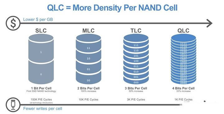 QLC(Quali-Level-Cell)自去年開始,QLC的市場(chǎng)份額就在不斷增加,今年預(yù)計(jì)會(huì)占到市場(chǎng)產(chǎn)能的1/3左右,NAND廠商目前對(duì)QLC閃存的定位是全方位取代SATA接口的固態(tài)硬盤,以大容量,傳輸速度更快且成本更低廉的QLC固態(tài)硬盤來(lái)淘汰傳統(tǒng)SATA接口硬盤,取代老式固態(tài)硬盤的市場(chǎng)份額。