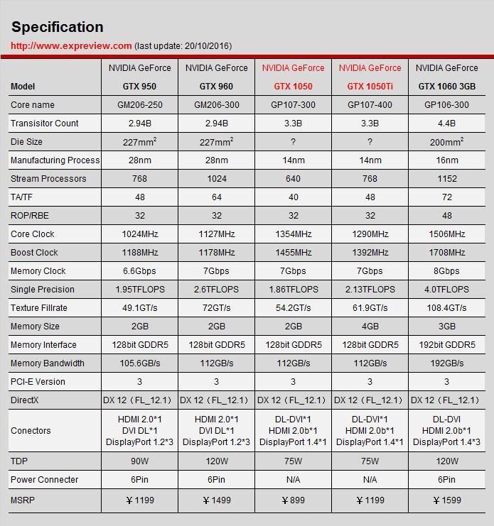 這是GTX 1050Ti發(fā)布時,expreview發(fā)布的對比表。