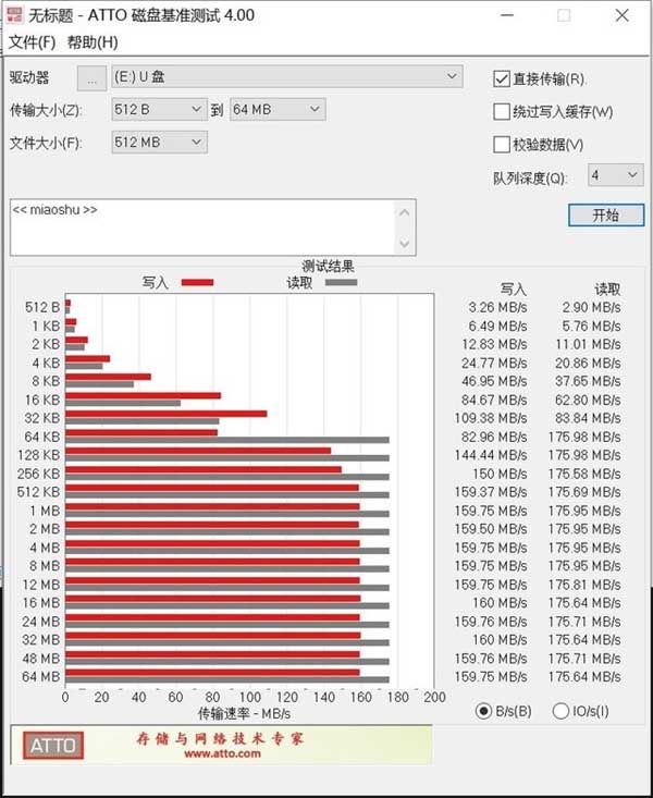 至于在不同數(shù)據(jù)塊的性能表現(xiàn)上,從128KB的主流數(shù)據(jù)塊開始,一直到64MB的較大數(shù)據(jù)塊,aigo U322一直保持著175MB/s最大連續(xù)讀取,159MB/s左右的最大連續(xù)寫入,反映了該優(yōu)盤在不同區(qū)塊場景下的穩(wěn)定高性能表現(xiàn)。