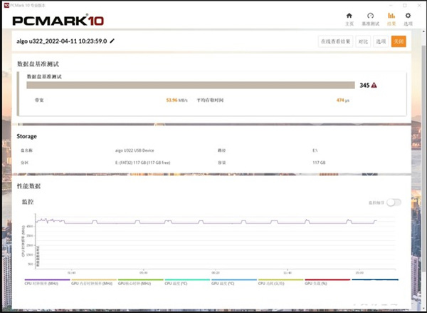 在該測試下,有三個數(shù)值值得參考,總得分上,aigo U322得到了393分,展現(xiàn)了在綜合的系統(tǒng)環(huán)境下該U盤的性能優(yōu)勢,在更為關(guān)鍵的帶寬和平均存取時間維度上,aigo U322同樣憑借著UDP一體封裝技術(shù)和嚴(yán)選顆aigo U322雙接口U盤實際測試