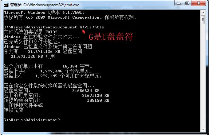 在彈出的窗口中輸入“convert G: /fs:ntfs”(G為U盤盤符)回車,等待執(zhí)行命令,轉(zhuǎn)化完成如下圖。