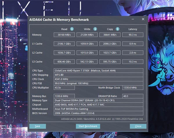 這個配置用來測試金百達DDR4 2666MHz 8G是綽綽有余了。因為AMD平臺的緣故,在測試里會出現(xiàn) 內(nèi)存寫入速度僅有讀取一半 的結(jié)果,這是因為AMD處理器是單CCX設(shè)計。先用AIDA64在默認頻率跑個分??梢钥吹?strong>,在默認2666MHz頻率里,金百達DDR4 2666MHz 8G的讀取速度為38168 MB/s,寫入速度為21284 MB/s,延時為90.3 ns,時序為20-19-19-43。
