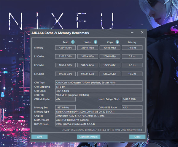 這次的測試結(jié)果就有較大的提升了。達到3000MHz后的讀取速度為42644 MB/s,寫入速度為23949 MB/s,延時為79.6 ns,時序為16-20-20-38。這與默認的2666MHz頻率的性能有了明顯的提升,這個成績在游戲時也能提供很良好的體驗了