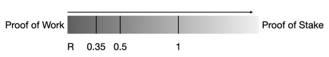 當(dāng)系數(shù)設(shè)計(jì)較低時(shí) GPoS 共識(shí)的經(jīng)濟(jì)特性會(huì)更接近于 PoW 共識(shí),這時(shí)網(wǎng)絡(luò)的安全性主要由存儲(chǔ)資源保障,利益分配會(huì)流向資源節(jié)點(diǎn);當(dāng) R 系數(shù)的設(shè)計(jì)較高時(shí) GPoS 共識(shí)的經(jīng)濟(jì)特性趨近于 PoS,網(wǎng)絡(luò)的安全性主要由 Staking 在網(wǎng)絡(luò)中的 CRU 通證來(lái)保障,利益的大比例將分配給持 CRU 的賬戶。則如下圖: