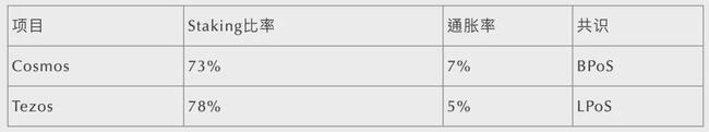在分析了現(xiàn)有的 PoS 項(xiàng)目的通證 Staking 比率后,普遍被認(rèn)同的安全比率約為 0.35~0.66,也就是 PoS 系統(tǒng)中被鎖定的通證占總量的 35%~66%。而實(shí)際項(xiàng)目中,Staking 比率區(qū)間可為 0.15~0.85,具體的原因是項(xiàng)目所在的階段和 Staking 收益率決定。下表是 Cosmos 和 Tezos 項(xiàng)目的 Staking 情況: