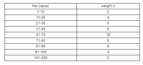 在網(wǎng)絡(luò)啟動(dòng)時(shí),我們?cè)O(shè)定 β=5,權(quán)重系數(shù) α 和對(duì)應(yīng)文件在網(wǎng)絡(luò)中的復(fù)本數(shù)量相關(guān),我們初始認(rèn)定權(quán)重系數(shù) α 的數(shù)值如下表: