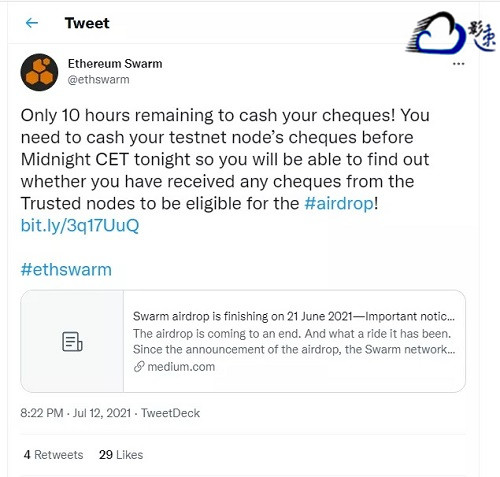 Swarm空投活動(dòng)結(jié)束,拉扯了一個(gè)多月, 空投活動(dòng)終于也算告一段落了。Swarm官方在7月12日晚上8點(diǎn)22分,發(fā)布了一條消息,距離支票兌換只剩下10小時(shí)。