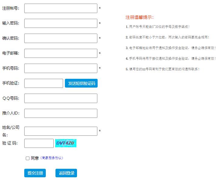 接下來就按照上圖中所示的內(nèi)容進行填寫,最后點擊下面的“提交注冊”完成注冊流程。需要注意右邊的“注冊溫馨提示”。還有需要注意的是,下面的內(nèi)容一定要填寫真實,這樣才能方便您后續(xù)的購買以及使用。
