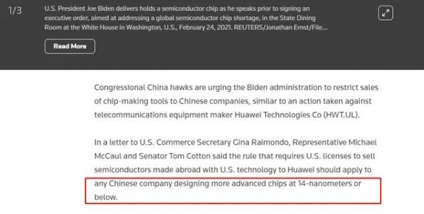 4月17日,據(jù)路透社報道,在給美國商務(wù)部長吉娜的一封信中,美國國會代表Michael McCaul和參議員Tom Cotton表示,要求將此前針對華為的禁令范圍擴大至14nm及以下制程的所有中國芯片公司!