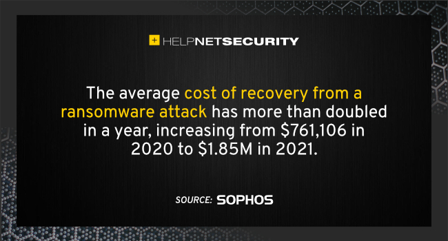 Sophos的一項(xiàng)調(diào)查顯示,勒索軟件攻擊的平均恢復(fù)總成本在一年內(nèi)增加了一倍以上,從2020年的761,106美元增加到2021年的185萬美元。支付的平均贖金為170,404美元。