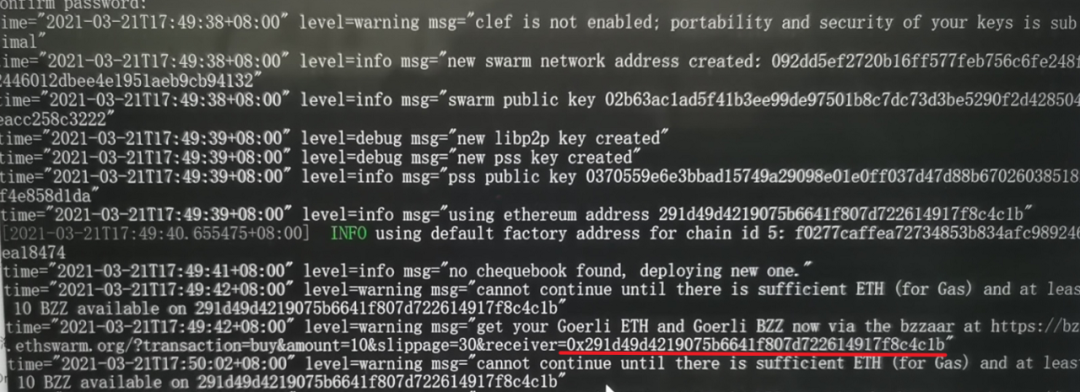 此時是第一次運行bee需要輸入密碼和確認密碼之后會看到一個讓你注入水龍頭代幣的錢包地址。