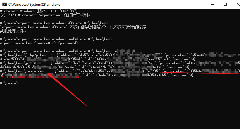 在命令行窗口執(zhí)行命令,swarm.key后面的引號內(nèi)文本就是私鑰,整段文本復制保存好。