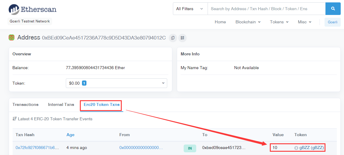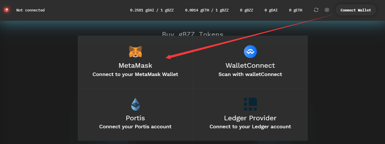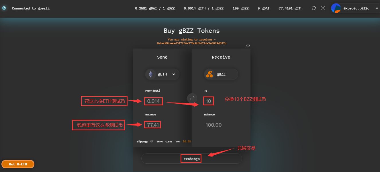 進(jìn)入BZZ測(cè)試幣兌換界面:https://bzz.ethswarm.org/?transaction=buy&amount=10&slippage=30&receiver= 0xbed09ceae4517236a778c9d5d43da3e80794012c