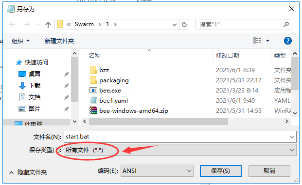 另存為start.bat,保存類型選擇“所有文件”。如圖: