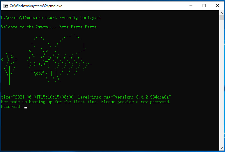 1、在d:\swarm\1目錄下雙擊“start.bat” 運行,輸入密碼,需要輸入兩次,如下圖: