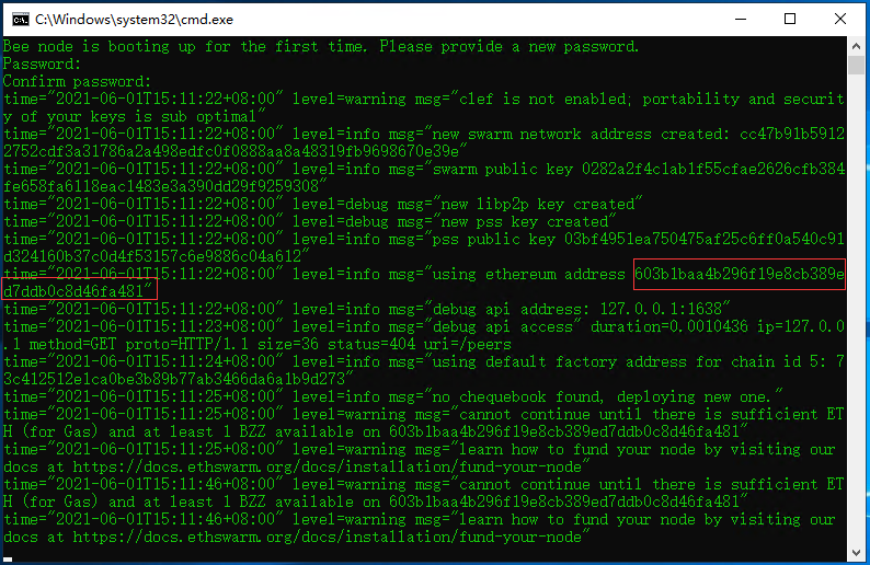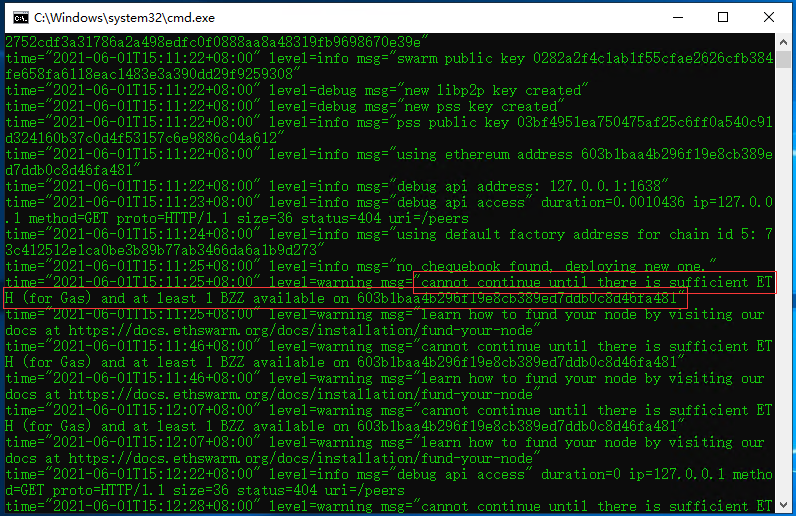 time=”2021-06-01T15:13:30+08:00″ level=warning msg=”cannot continue until there is sufficient ETH (for Gas) and at least 1 BZZ available on 603b1baa4b296f19e8cb389ed7ddb0c8d46fa482″