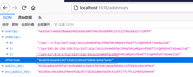 瀏覽器里輸入http://localhost:1638/addresses?可查看節(jié)點1錢包地址,ethereum對應(yīng)的部分就是錢包地址了。