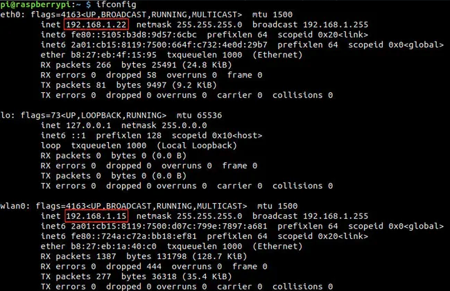 步驟2.3:如果Raspberry Pi與計(jì)算機(jī)位于同一網(wǎng)絡(luò)中,則需要在提供的鏈接中更改IP地址。要查找您的Raspberry Pi的IP地址,請(qǐng)執(zhí)行以下終端命令:“ ifconfig”。您應(yīng)該看到以下內(nèi)容:
